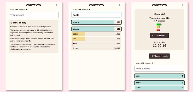 Contexto is a game similar to Wordle. In the current version, people have to guess a secret word and they can make as many guesses as they want. Also, the
