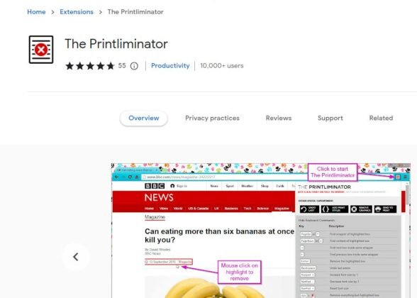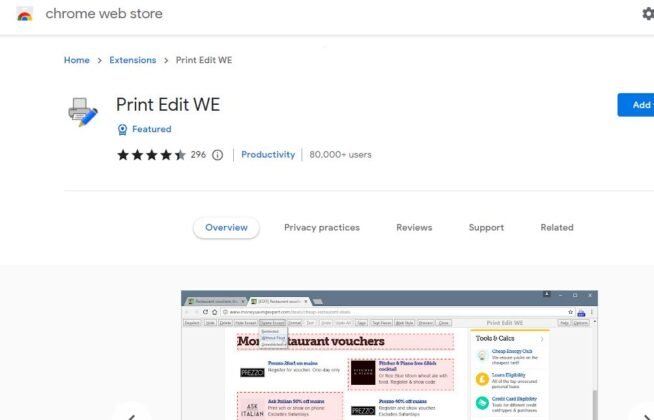 Print Edit WE is a Google Chrome extension that lets users edit pages before printing and gives access to delete, hide, and format elements from that page. It also provides